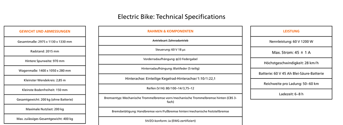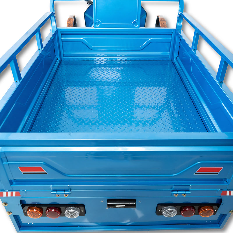 Die Akkureichweite des Elektro-Lastendreirads beträgt bis zu 60 Kilometer bei 28 km/h (17,3 mph). Das vollständige Aufladen dauert etwa 6–8 Stunden.
